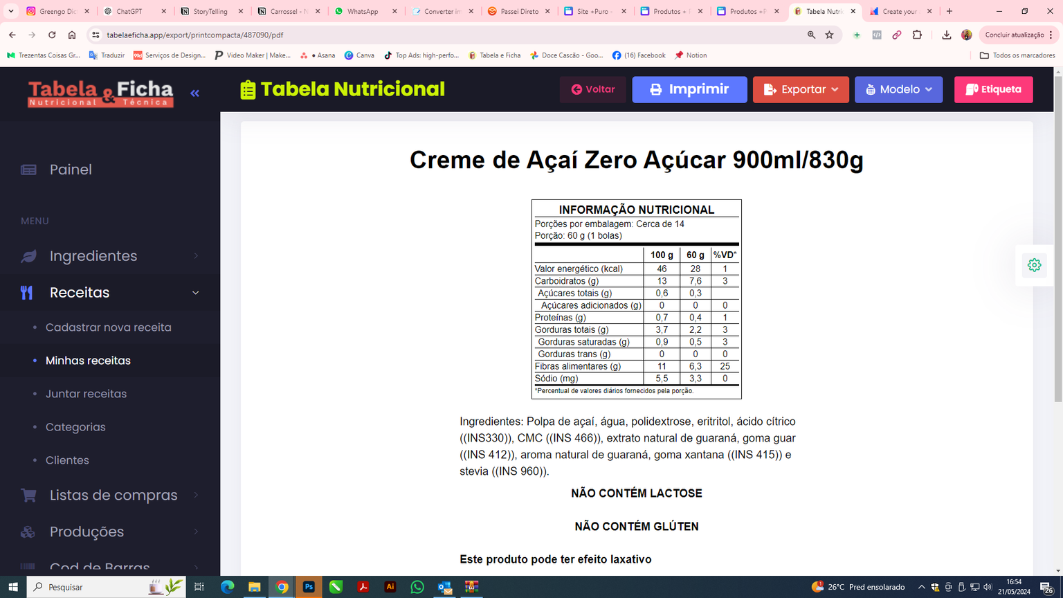 Ingredientes: Polpa de açaí, água, polidextrose, eritritol, ácido cítrico ((INS330)), CMC ((INS 466)), extrato natural de guaraná, goma guar ((INS 412)), aroma natural de guaraná, goma xantana ((INS 415)) e stevia ((INS 960)).