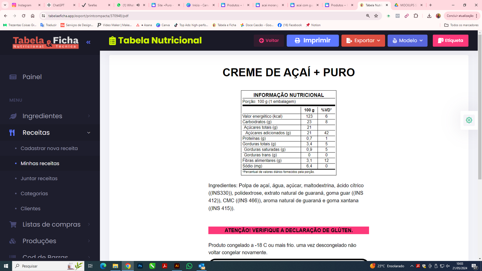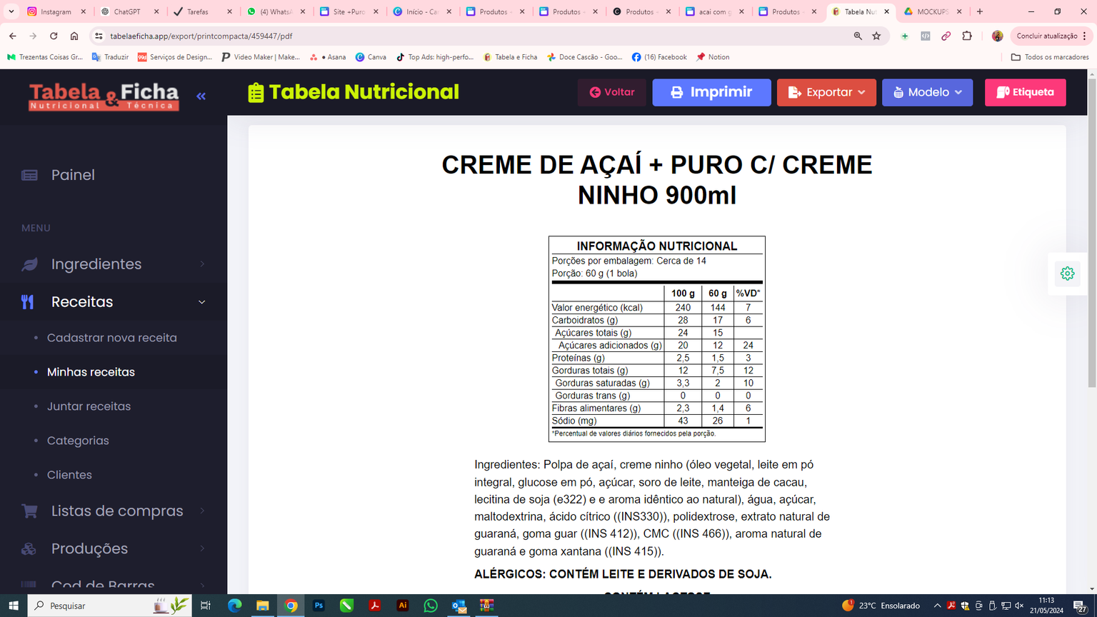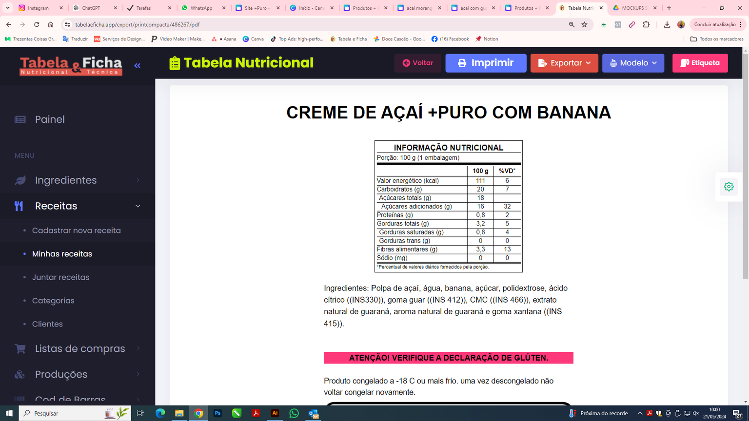 Ingredientes: Polpa de açaí, creme ninho (óleo vegetal, leite em pó integral, glucose em pó, açúcar, soro de leite, manteiga de cacau, lecitina de soja (e322) e e aroma idêntico ao natural), água, açúcar, maltodextrina, ácido cítrico ((INS330)), polidextrose, extrato natural de guaraná, goma guar ((INS 412)), CMC ((INS 466)), aroma natural de guaraná e goma xantana ((INS 415)).