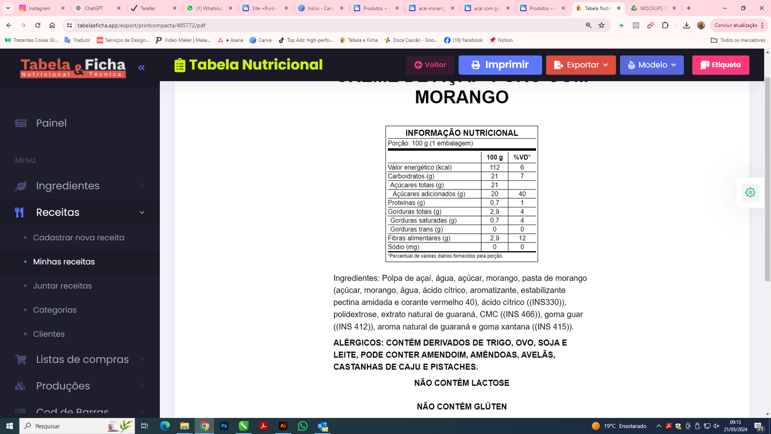 Ingredientes: Polpa de açaí, água, açúcar, morango, pasta de morango (açúcar, morango, água, ácido cítrico, aromatizante, estabilizante pectina amidada e corante vermelho 40), ácido cítrico ((INS330)), polidextrose, extrato natural de guaraná, CMC ((INS 466)), goma guar ((INS 412)), aroma natural de guaraná e goma xantana ((INS 415)).